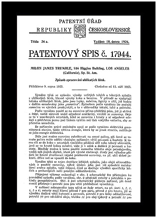 A number of today’s industrial patents show the name of MJ Trumble as an earlier inventor upon whose ideas new improvements were designed into the 21st century. Tracing the path of patents shows first steps that led to later inventions. Trumble's patents were among the first one million patents registered in the United States. Improvements are as recent as 2007. He licensed his first registered patents when he was in his mid-twenties and became a millionaire by age 30 in 1909. His oil refining patent below was granted and registered in Czechoslovakia in 1926.