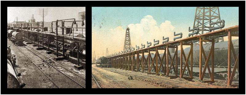 Rail cars transporting fuel were used for years before pipes could span treacherous territory. A 1911 fuel-loading depot in California is shown below on the right. This system used pumps and gravity to fill rail cars. As regional oil and gas pipelines were constructed, any means that could be assembled and financed was pulled in wherever needed to transport fuel, including mule and horse teams pulling rows of tanks on wheels. An 1800's fuel depot in Baku, Russia is below on the left. Ideas flowed building energy transport during MJ Trumble's career.