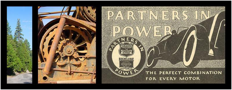 Among artifacts from early energy development in the U.S. West is pumping equipment shown above in the middle. This oil derrick is on display at Olinda Museum in Brea, California where MJ Trumble began his career. ‘Partners in Power’ above on the right was a 1927 advertising campaign by the oil company Atlantic Richfield.